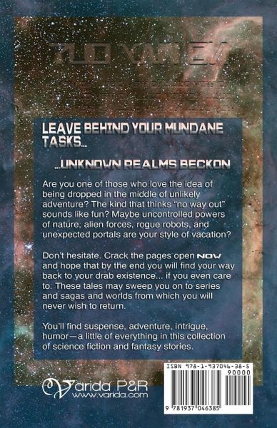 LEAVE BEHIND YOUR MUNDANE TASKS... ...UNKNOWN REALMS BECKON Are you one of those who love the idea of being dropped in the middle of unlikely adventure? The kind that thinks "no way out" sounds like fun? Maybe uncontrolled powers of nature, alien forces, rogue robots, and unexpected portals are your style of vacation? Don't hesitate. Crack the pages open NOW and hope that by the end you will find your way back to your drab existence... if you even care to. These tales may sweep you on to series and sagas and worlds from which you will never wish to return. You'll find suspense, adventure, intrigue, humor-a little of everything in this collection of science fiction and fantasy stories. Contributing Authors Suzanne Hagelin-Suzanne is living in a sci-fi realm, writing, editing, publishing, altering the timeline... now.¿Nia Jean-Reading and writing have been Nia's obsession since she first learned to write the word "cat" and began crafting worlds, characters, and adventures. Those who have been captivated by her storytelling have waited patiently for her stories to be sculpted into living books. Her first fantasy novel is "Catspaw". Many others await in the wings. Eric Little-Eric writes the kind of science fiction he loves to read; world-building with plenty of good action scenes and characters that have a habit of coming alive and not cooperating with his initial plans. He lives on the Olympic Peninsula in Washington surrounded by his beloved rainforest and the sea. His books include the Good Wolf series: "Bad Dog Good Wolf" and "Bad Cat Good Wolf"; as well as "Summerlight", the first volume of the Summer War Cycle. Stephen Hagelin-Stephen is an author of epic fantasy books, including the Wingbreaker Saga and the upcoming Arcane Archaeologist series. Most recently he has published "The Lich's Blade," the third Wingbreaker novel. Between working full time, writing, and caring for his child with a chromosome deletion, he is not active on social media. Denise Kawaii-Once upon a time, in the mystical land of Washington State, there lived a reclusive writer named Denise Kawaii who, unbeknownst to her neighbors, possessed an extraordinary gift. She wrote the gateways to realms unknown, all from the comfort of a red Sihoo ergonomic desk chair. Her books include the dystopian, YA sci-fi "Adaline" series about an AI run cloning program on autopilot.