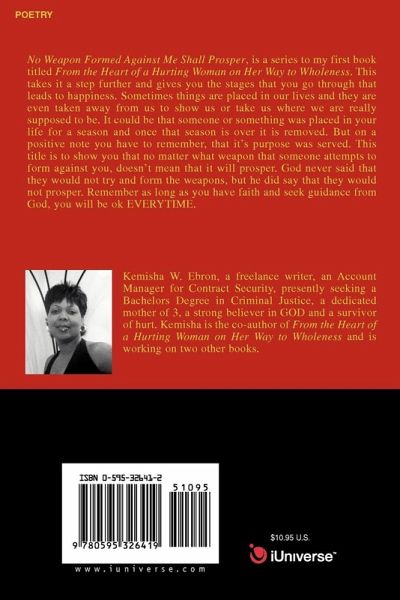 No Weapon Formed Against Me Shall Prosper, is a series to my first book titled From the Heart of a Hurting Woman on Her Way to Wholeness. This takes it a step further and gives you the stages that you go through that leads to happiness. Sometimes things are placed in our lives and they are even taken away from us to show us or take us where we are really supposed. It could be that someone or something was placed in your life for a season and once that season is over it is removed. But on a positive note you have to remember, that it's purpose was served. This title is to show you that no matter what weapon that someone attempts to form against you, doesn't mean that it will prosper. God never said that they would not try and form the weapons, but he did say that they would not prosper. Remember as long as you have faith and seek guidance from God, you will be ok EVERYTIME.