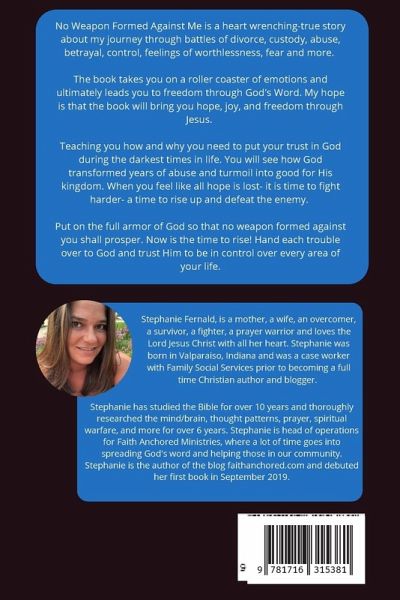 No Weapon Formed Against Me is a heart wrenching-true story about my journey through battles of divorce, custody, abuse, betrayal, control, feelings of worthlessness, fear and more. The book takes you on a roller coaster of emotions and ultimately leads you to freedom through God's Word. My hope is that the book will bring you hope, joy, and freedom through Jesus. Teaching you how and why you need to put your trust in God during the darkest times in life. You will see how God transformed years of abuse and turmoil into good for His kingdom. When you feel like all hope is lost- it is time to fight harder- a time to rise up and defeat the enemy. Put on the full armor of God so that no weapon formed against you shall prosper. Now is the time to rise! Hand each trouble over to God and trust Him to be in control over every area of your life.