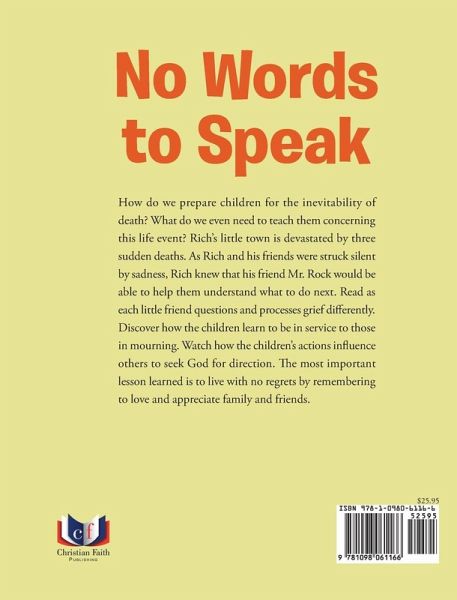 How do we prepare children for the inevitability of death? What do we even need to teach them concerning this life event? Rich's little town is devastated by three sudden deaths. As Rich and his friends were struck silent by sadness, Rich knew that his friend Mr. Rock would be able to help them understand what to do next. Read as each little friend questions and processes grief differently. Discover how the children learn to be in service to those in mourning. Watch how the children's actions influence others to seek God for direction. The most important lesson learned is to live with no regrets by remembering to love and appreciate family and friends.…mehr