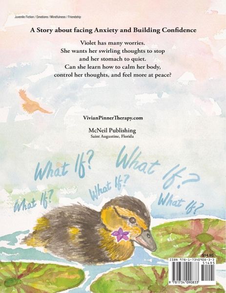 Violet the duck has worries. Life on the pond with her family and friends comfort at times, but worries swirl about school what other friends think. She has stomachaches and tries to push her worries away. A wise old owl teaches Violet and her friend Chelsea Chipmunk how to control her worries so that she can have a peaceful life and even teaches her friend, Timothy Turtle how to stop the swirling in his head.