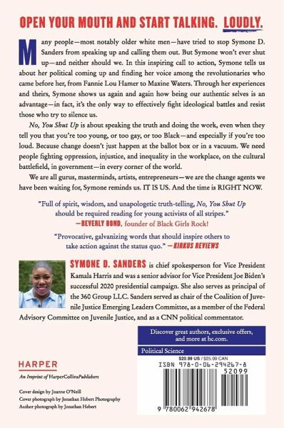 ?Symone's honest and profound reflection on standing up and speaking out is sure to inspire young people across the country to become the change agents the world needs.? ? Congresswoman Maxine Waters In this rousing call to leadership, the self-described millennial spokesperson for the culture, CNN's designated "woke AF" former commentator, and the youngest national press secretary in the history of the United States shares her take-no-prisoners approach to life, politics, and career success, and shows a new generation how to be loud and powerful in their own right. Many people?most notably white older men?may try to stop Symone Sanders from speaking up and out. But Symone will NOT shut up. And neither should you. In this inspiring call-to-action, Symone tells stories from her own life of not-shutting-up alongside loud young revolutionaries who came before her to help you find your authentic voice and use it to your advantage; to fight ideological battles more effectively; and to resist those who try to silence you. We are all gurus, masterminds, artists, entrepreneurs?we are the change agents we have been waiting for. IT IS US. And the time is RIGHT NOW. I know you're wondering, ?But HOW?? And we don't have all the answers! Symone is the first to admit we're all winging it in one way or another. But the point is we're out there doing it. So get started. Open your mouth and start talking. Loudly. No You Shut Up goes beyond the surplus of ?Vote-Or-Die? books we've seen before. Because change doesn't just happen at the ballot box. We need people fighting oppression, injustice, and inequality?in the workplace, on the cultural battlefield, in government, in every corner of the world. With spirited storytelling filtered through a voice that cannot and will not be ignored, Symone inspires you to start now. You don't need to have all the answers, or wait your turn to help create the change you want to see. All you need is a new toolbox, an unshakable commitment, and the confidence and guidance to wield those tools effectively.