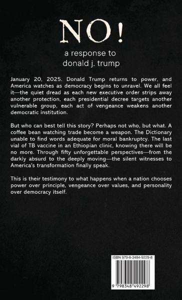 January 20, 2025. Donald Trump returns to power, and America watches as democracy begins to unravel. We all feel it-the quiet dread as each new executive order strips away another protection, each presidential decree targets another vulnerable group, each act of vengeance weakens another democratic institution. But who can best tell this story? Perhaps not who, but what. A coffee bean watching trade become a weapon. The Dictionary unable to find words adequate for moral bankruptcy. The last vial of TB vaccine in an Ethiopian clinic, knowing there will be no more. Through fifty unforgettable perspectives-from the darkly absurd to the deeply moving-the silent witnesses to America's transformation finally speak. This is their testimony to what happens when a nation chooses power over principle, vengeance over values, and personality over democracy itself.