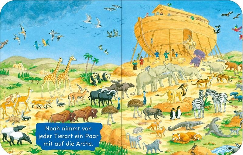 Der Affe klaut die Vorräte, das Eis der Eisbären tropft und ärgert die anderen Tiere. In diesem kleinen Wimmelbuch können schon die Kleinsten viele spannende Details entdecken und lernen so spielerisch eine der bekanntesten biblischen Erzählungen kennen. Die zahlreichen abgebildeten Tiere laden zum Sprechen und Geräusche machen ein. Beim Anschauen des Buches erfahren Kinder: Gott ist unser Freund. Er hat versprochen, dass er immer auf uns aufpasst.