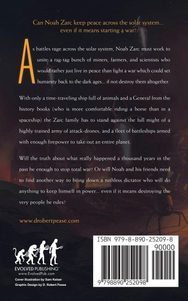Can Noah Zarc keep peace across the solar system... even if it means starting a war? As battles rage across the solar system, Noah Zarc must work to unite a rag-tag bunch of miners, farmers, and scientists who would rather just live in peace than fight a war which could set humanity back to the dark ages... if not destroy them altogether. With only a time-traveling ship full of animals and a General from the history books (who is more comfortable riding a horse than in a spaceship) the Zarc family has to stand against the full might of a highly trained army of attack-drones, and a fleet of battleships armed with enough firepower to take out an entire planet. Will the truth about what really happened a thousand years in the past be enough to stop total war? Or will Noah and his friends need to find another way to bring down a ruthless dictator who will do anything to keep himself in power... even if it means destroying the very people he rules? "Pease's strength as a storyteller lies in his ability to connect multiple time periods imaginatively, as well as Noah's excited, fast-paced narration." ~ Publishers Weekly EVOLVED PUBLISHING PRESENTS the third and final book in the multiple award-winning Noah Zarc series of science fiction time travel adventures-an out-of-this-world, action-packed thrill ride. The Lexile® Framework® for Reading = 650L