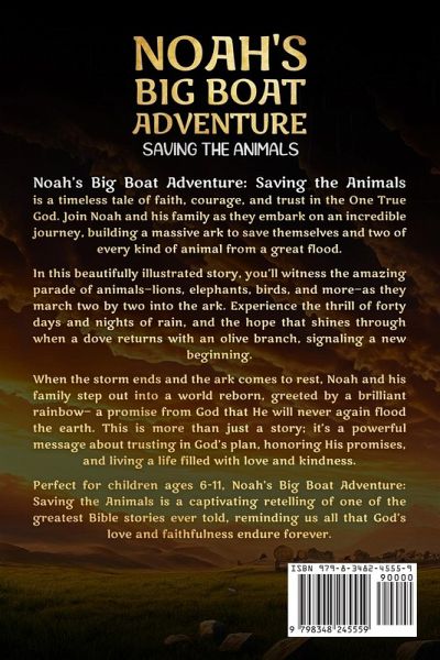 Noah's Big Boat Adventure: Saving the Animals is a captivating retelling of one of history's most cherished stories. Join Noah and his family as they embark on an extraordinary journey to save every living creature from an impending flood. Entrusted with a divine mission, Noah builds a massive ark, following God's guidance and preparing a sanctuary for animals of every kind-from towering giraffes to tiny insects. Each step is a testament to faith, courage, and compassion. As rain pours for 40 days and 40 nights, the ark becomes a beacon of hope and survival. Inside its sturdy walls, Noah and his family navigate the storm, caring for the animals and trusting in God's promise to protect them. The vibrant descriptions bring the ark to life, immersing young readers in the adventure of feeding, sheltering, and bonding with the creatures. Through these moments, children learn the values of teamwork, perseverance, and responsibility for creation. When the storm finally subsides, a dove returns with an olive branch, signaling the floodwaters have receded and that it's time for a new beginning. The concluding image of a rainbow-a symbol of God's covenant-offers a powerful message of hope and renewal. This beautifully illustrated book is perfect for children ages 6-12. It brings the timeless lessons of Noah's story to life, teaching the importance of compassion, faith, and the profound bond between humans and nature. Whether read at bedtime, in Sunday school, or during quiet moments of reflection, Noah's Big Boat Adventure inspires children to embrace their roles as protectors of the Earth and its creatures. Through Noah's example, young readers learn to face challenges with bravery, work together to overcome obstacles, and trust in the greater plan. With engaging storytelling and relatable themes, this book captivates children while instilling core values that will guide them through life. Noah's Big Boat Adventure: Saving the Animals is more than a story-it's an inspiring journey that children will treasure for years to come. This unforgettable tale of hope and resilience reminds us that even in the face of life's greatest storms, faith can carry us through, and every act of kindness makes a difference.