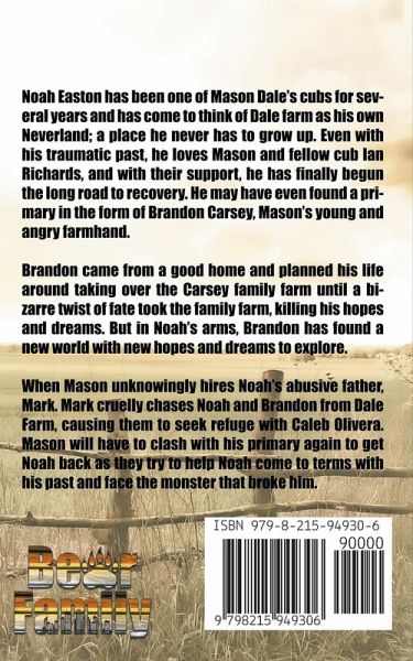 Noah Easton has been one of Mason Dale's cubs for several years and has come to think of Dale farm as his own Neverland; a place he never has to grow up. Even with his traumatic past, he loves Mason and fellow cub Ian Richards and with their support he has finally begun the long road to recovery. He may have even found a primary in the form of Brandon Carsey, Mason's young and angry farmhand. Brandon came from a good home and planned his life around taking over the Carsey family farm, until a bizarre twist of fate took the family farm, killing his hopes and dreams. But in Noah's arms, Brandon has found a new world, with new hopes and dreams to explore. When Mason unknowingly hires, Noah's abusive father, Mark. Mark cruelly chases Noah and Brandon from Dale Farm causing them to seek refuge with Caleb Olivera. To get Noah back, Mason will have to clash with his primary again as they try to help Noah come to terms with his past and face the monster that broke him.