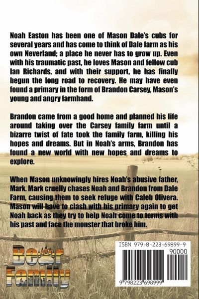Noah Easton has been one of Mason Dale's cubs for several years and has come to think of Dale farm as his own Neverland; a place he never has to grow up. Even with his traumatic past, he loves Mason and fellow cub Ian Richards and with their support he has finally begun the long road to recovery. He may have even found a primary in the form of Brandon Carsey, Mason's young and angry farmhand. Brandon came from a good home and planned his life around taking over the Carsey family farm, until a bizarre twist of fate took the family farm, killing his hopes and dreams. But in Noah's arms, Brandon has found a new world, with new hopes and dreams to explore. When Mason unknowingly hires, Noah's abusive father, Mark. Mark cruelly chases Noah and Brandon from Dale Farm causing them to seek refuge with Caleb Olivera. To get Noah back, Mason will have to clash with his primary again as they try to help Noah come to terms with his past and face the monster that broke him.