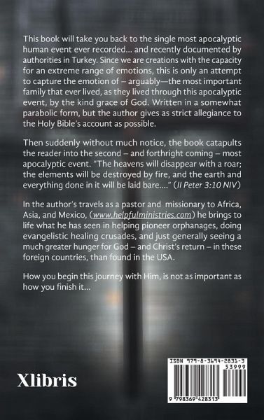 This book will take you back to the single most apocalyptic human event ever recorded... and recently documented by authorities in Turkey. Since we are creations with the capacity for an extreme range of emotions, this is only an attempt to capture the emotion of - arguably-the most important family that ever lived, as they lived through this apocalyptic event, by the kind grace of God. Written in a somewhat parabolic form, but the author gives as strict allegiance to the Holy Bible's account as possible. The suddenly without much notice, the book catapults the reader into the second - and forthright coming - most apocalyptic event. "The heavens will disappear with a roar; the elements will be destroyed by fire, and the earth and everything done in it will be laid bare...." (II Peter 3:10 NIV) In the author's travels as a pastor and missionary to Africa, Asia, and Mexico, (www.helpfulministries.com) he brings to life what he has seen in helping pioneer orphanages, doing evangelistic healing crusades, and just generally seeing a much greater hunger for God - and Christ's return - in these foreign countries, than found in the USA. How you begin this journey with Him, is not as important as how you finish it...