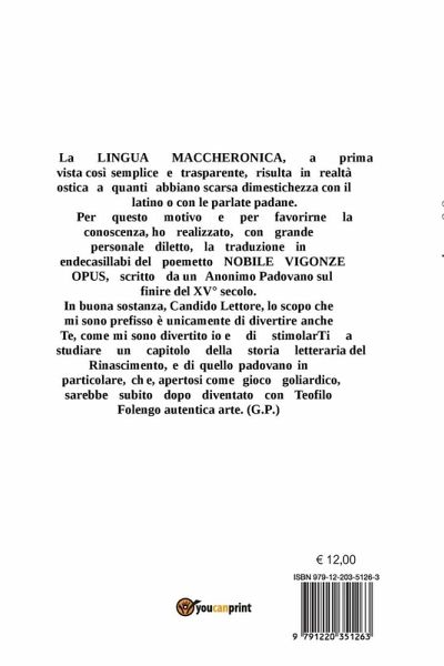 Solo dopo tre secoli e più da quella francese è apparsa la prima traduzione integrale italiana del Baldus di Teofilo Folengo: Il Baldo, di Giuseppe Tonna, Giangiacomo Feltrinelli Editore, Milano 1958. Del 1961, per i tipi di Einaudi, è la prima traduzione italiana della Zanitonella, sempre del Folengo, ad opera di Giorgio Bernardi Perini. I prefolenghiani sono invece tuttora relegati nell'ambito strettamente erudito e specialistico. E' purtuttavia vero che la Lingua Maccheronica, a prima vista così semplice e trasparente, risulta in realtà ostica a quanti hanno scarsa dimestichezza con il latino e/o con le parlate padane, ed è per tal motivo e per favorirne conoscenza e comprensione che mi sono accinto a tradurre in italiano il Nobile Vigonze Opus, scritto da un Anonimo Padovano, presumibilmente nel 1494, ed edito a Venezia nel 1502. Il fac-simile di tale prima stampa è stato inserito in questo libro. Auguro al Candido Lettore lo stesso mio divertimento, e lo stimolo a studiare un capitolo della storia letteraria del Rinascimento, padovano in particolare, che, apertosi come gioco goliardico, sarebbe subito dopo diventato, appunto con Teofilo Folengo, autentica arte.
