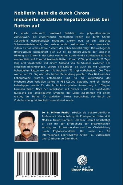Es wurde untersucht, inwieweit Nobiletin, ein polymethoxyliertes Zitrusflavon, bei erwachsenen männlichen Ratten die durch Chrom ausgelöste Hepatotoxizität reduziert. Chrom (Cr) ist ein toxisches Schwermetallelement, das wahrscheinlich oxidativen Stress verursacht, indem es das antioxidative System der Leber beeinträchtigt. Die vorliegende Untersuchung konzentriert sich auf (i) die Untersuchung der toxischen Wirkung von Chrom in der Leber von Ratten sowie (ii) die schützende Wirkung von Nobiletin auf Chrom-intoxizierte Ratten. Chrom (700 ppm) wurde 21 Tage lang oral verabreicht, mit einem Abstand von 24 Stunden zwischen den einzelnen Behandlungen. Sowohl die Kontroll- als auch die mit Cadmium behandelten Ratten wurden mit Nobiletin (75 mg) vorbehandelt. Die Tiere wurden am 22. Tag nach der letzten Behandlung geopfert. Das Blut und das Lebergewebe wurden entnommen und für die Auswertung der biochemischen Variablen sofort in PBS-Lösung getaucht, und ein kleiner Leberlappen wurde für die lichtmikroskopische Auswertung in 10%igem Formalin fixiert. Nach der Intoxikation mit Chrom wurde ein signifikanter Rückgang des antioxidativen Systems der Leber zusammen mit einem Anstieg der Marker für oxidativen Stress beobachtet, der durch die Vorbehandlung mit Nobiletin normalisiert wurde.