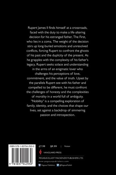 Rupert James II finds himself at a crossroads, faced with the duty to make a life-altering decision for his estranged father, The First, who lies in a coma. The weight of the decision stirs up long-buried emotions and unresolved conflicts, forcing Rupert to confront the ghosts of his past and the duplicity of the present. As he grapples with the complexity of his father's legacy, Rupert seeks solace and understanding in the arms of an enigmatic lover who challenges his perceptions of love, commitment, and the value of truth. Upset by the parallels Rupert see with his father and compelled to be different, he must confront the challenges of honesty and the complexities of morality in a world full of ambiguity. "Nobility" is a compelling exploration of family, identity, and the choices that shape our lives, set against a backdrop of simmering passion and introspection.