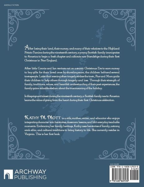 After losing their land, their money, and many of their relatives to the Highland Potato Famine during the nineteenth century, a young Scottish family immigrates to America to begin a fresh chapter and cultivate new friendships during their first Christmas in New England. After little Connie and Ian venture out on a snowy Christmas Eve to earn money to buy gifts for their loved ones by shoveling snow, the children befriend several townspeople. Later that evening when tragedy strikes the town, Paw and Mum guide their children to help others through tragedy and loss. Through their strength of family, traditions, values, and heartfelt understanding of their past experiences, the family gains valuable wisdom about the true meaning of the holiday. In this poignant tale set during the nineteenth century, a Scottish family new to America learns the value of giving from the heart during their first Christmas celebration.