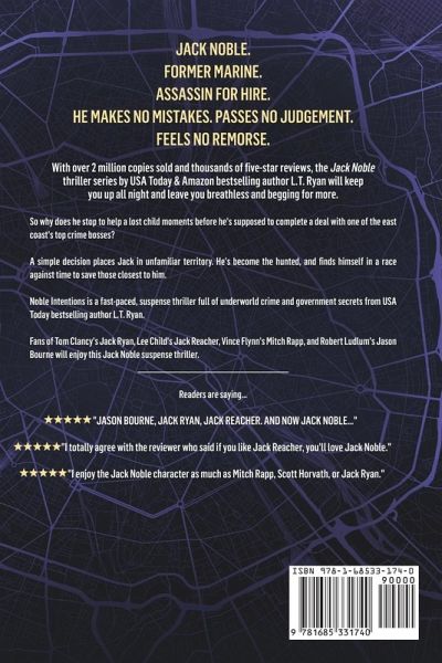 JACK NOBLE. Marine. Assassin for hire. He makes no mistakes. Passes no judgement. Feels no remorse. So why does he stop to help a lost child moments before he's supposed to complete a deal with one of the east coast's top crime bosses? A simple decision places Jack in unfamiliar territory. He's become the hunted, and finds himself in a race against time to save those closest to him. Cinematically written, Noble Intentions is a fast-paced, suspense thriller full of underworld crime and government secrets from USA Today bestselling author L.T. Ryan. Fans of Tom Clancy's Jack Ryan, Lee Child's Jack Reacher, Vince Flynn's Mitch Rapp, and Robert Ludlum's Jason Bourne will enjoy this Jack Noble action thriller.