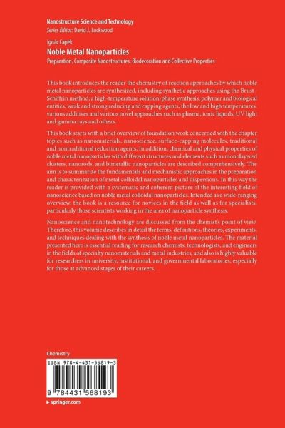 This book introduces the reader the chemistry of reaction approaches by which noble metal nanoparticles are synthesized, including synthetic approaches using the Brust-Schiffrin method , a high-temperature solution-phase synthesis, polymer and biological entities, weak and strong reducing and capping agents, the low and high temperatures, various additives and various novel approaches such as plasma, ionic liquids, UV light and gamma rays and others.