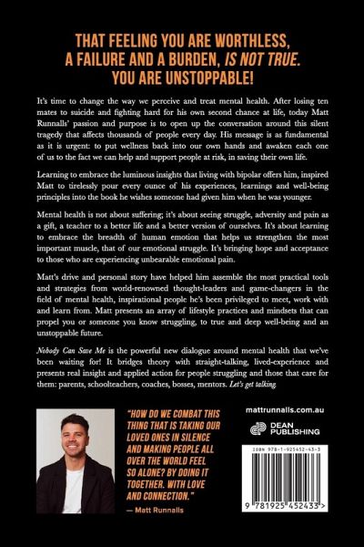 "That feeling you are worthless, a failure and a burden, is not true. You are unstoppable!" - Matt Runnalls It's time to change the way we perceive and treat mental health. After losing ten mates to suicide and fighting hard for his own second chance at life, today Matt Runnalls' passion and purpose is to open up the conversation around this silent tragedy that affects thousands of people every day. His message is as fundamental as it is urgent: to put wellness back into our own hands and awaken each one of us to the fact we can help and support people at risk, in saving their own life. Learning to embrace the luminous insights that living with bipolar offers him, inspired Matt to tirelessly pour every ounce of his experiences, learnings and well-being principles into the book he wishes someone had given him when he was younger. Mental health is not about suffering; it's about seeing struggle, adversity and pain as a gift, a teacher to a better life and a better version of ourselves. It's about learning to embrace the breadth of human emotion that helps us strengthen the most important muscle, that of our emotional struggle. It's bringing hope and acceptance to those who are experiencing unbearable emotional pain. Matt's drive and personal story have helped him assemble the most practical tools and strategies from world-renowned thought-leaders and game-changers in the field of mental health, inspirational people he's been privileged to meet, work with and learn from. Matt presents an array of lifestyle practices and mindsets that can propel you or someone you know struggling, to true and deep well-being and an unstoppable future. Nobody Can Save Me is the powerful new dialogue around mental health that we've been waiting for! It bridges theory with straight-talking, lived-experience and presents real insight and applied action for people struggling and those that care for them: parents, schoolteachers, coaches, bosses, mentors. Let's get talking. "A personal hero of mine. Matt's unique perspective has helped thousands. This book is a must-read if you've ever experienced brain pain." Kevin Hines, bestselling author of Cracked, Not Broken: Surviving and Thriving After A Suicide Attempt.