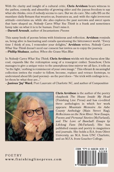 Nobody Cares What You Think authentically reflects, digests, and illuminates living in our world today. This is a book for grown-ups who have been, and seen, a myriad of people navigating this planet. It offers conclusions, observations, and puzzles with precision, wit and snap.