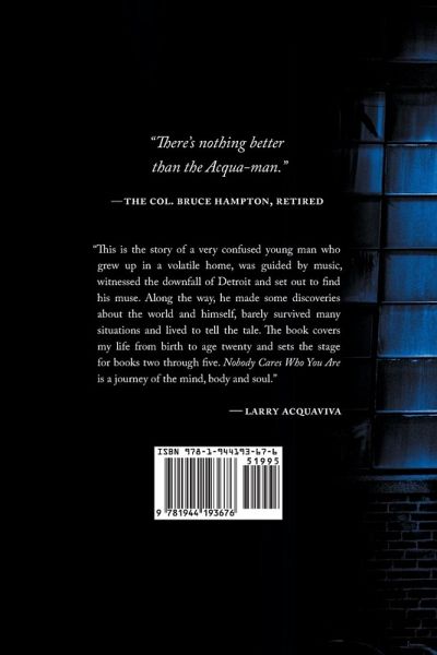 This is the story of a very confused young man who grew up in a volatile home, was guided by music, witnessed the downfall of Detroit and set out to find his muse. Along the way, he made some discoveries about the world and himself, barely survived many situations and lived to tell the tale. The book covers my life from birth to age twenty and sets the stage for books two through five. Nobody Cares Who You Areis a journey of the mind, body and soul. -Larry Acquaviva