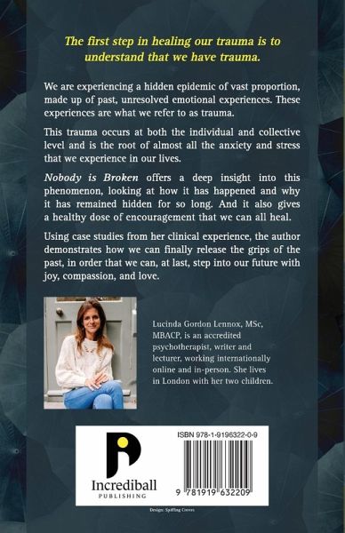 The first step in healing our trauma is to understand that we have trauma. We are experiencing a hidden epidemic of vast proportion, made up of past, unresolved emotional experiences. These experiences are what we refer to as trauma. This trauma occurs at both the individual and collective level and is the root of almost all the anxiety and stress that we experience in our lives. Nobody is Broken offers a deep insight into this phenomenon, looking at how it has happened and why it has remained hidden for so long. And it also gives a healthy dose of encouragement that we can all heal. Using case studies from her clinical experience, the author demonstrates how we can finally release the grips of the past, in order that we can, at last, step into our future with joy, compassion, and love. - Lucinda Gordon Lennox, MSc, MBACP, is an accredited psychotherapist, writer and lecturer, working internationally online and in-person. She lives in London with her two children.
