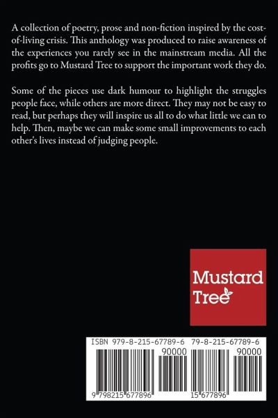 A collection of poetry, prose and non-fiction inspired by the cost-of-living crisis. Edited by Amanda Nicholson with writing by over 30 poets and authors from around the UK. This anthology was produced to raise awareness of the experiences you rarely see in the mainstream media. All the profits go to Mustard Tree to support the important work they do. Some of the pieces use dark humour to highlight the struggles people face, while others are more direct. They may not be easy to read, but perhaps they will inspire us all to do what little we can to help. Then, maybe we can make some small improvements to each other's lives instead of judging people.