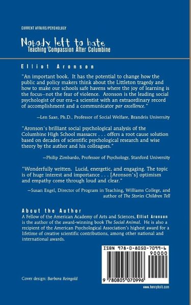 On April 20, 1999, the halls of Columbine High School in Littleton, Colorado, reverberated with the sound of gunshots as two students, highly armed and consumed with rage, killed thirteen students and seriously injured twenty-three before turning the guns on themselves. It was the worst school massacre in out nation's history. Can we prevent a tragedy like this from happening again? In Elliot Aronson's Nobody Left to Hate, on of our nation's leading social psychologists argues that the negative atmosphere in our schools--the exclusion, taunting, humiliation, and bullying--played a major role in triggering the pathological behavior of the shooters. At the very least, such an atmosphere makes schools an unpleasant experience for most normal students. But it doesn't have to be. Nobody Left to Hate offers concise, practical, and easy-to-apply strategies for creating a more supportive, stimulating, and compassionate environment in our schools. Based on decades of scientific research and classroom testing, these strategies explain how students can be taught to control their own impulses, how to respect others, and how to resolve conflicts amicably. In addition, they show teachers how to structure classes to promote cooperation, rather than competition, without sacrificing academics. On the contrary, education is greatly enhanced. For parents, teachers, or anyone concerned with what is happening in our schools, Nobody Left to Hate provides a simple and effective plan of action that will make their children's school not only a safe place, but a more humane place of learning.