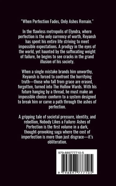 "When Perfection Fades, Only Ashes Remain." Reyansh, a prodigy molded by the ruthless expectations of Indraya's Core, lives a life of relentless pursuit-perfection or nothing. In a world where failure is a crime and mediocrity leads to exile, Reyansh strives to meet impossible standards. But beneath his flawless exterior lies a storm of anxiety and fear, threatening to shatter everything. When a crack in the facade of Core's perfection exposes a chilling truth, Reyansh's world spirals into chaos. As he confronts the grim fate of the Hollow Wards-obedient souls stripped of identity-he realizes that perfection has a price. The price is his very soul. Torn between duty and rebellion, Reyansh must make an impossible choice: to uphold a broken system or let it collapse and embrace the ashes. But in a world where failure is unforgivable, even a flicker of defiance can set fire to perfection. Will Reyansh rise from the ashes... or become one of them? The Ashes of Perfection is the first gripping volume of the Nobody Likes a Failure series-a tale of rebellion, sacrifice, and the haunting cost of chasing perfection.
