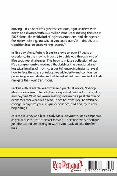 Moving-it's one of life's greatest stressors, right up there with death and divorce. With 25.6 million Americans making the leap in 2023 alone, the whirlwind of logistics, emotions, and change can feel overwhelming. But what if you could transform this chaotic transition into an empowering journey? In Nobody Move, Robert Esposito draws on over 17 years of experience in the moving industry to guide you through one of life's toughest challenges. This book isn't just a collection of tips; it's a comprehensive roadmap that bridges the emotional and logistical hurdles of moving. Esposito's engaging insights reveal how to face the stress of relocating with clarity and confidence, providing proven strategies that have helped countless individuals navigate their own transitions. Packed with relatable anecdotes and practical advice, Nobody Move equips you to handle the unexpected twists of moving day and beyond. Whether you're seeking closure on a past chapter or excitement for what lies ahead, Esposito invites you to embrace change, recognize your unique experience, and find joy in new beginnings. Join the journey and let Nobody Move be your trusted companion as you tackle the intricacies of moving-because every ending is just the start of something new. Are you ready to take the first step?