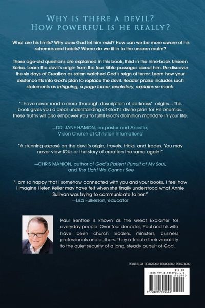 Why is there a devil? How powerful is satan really? What are his limits? Why does God let him exist? How can we be more aware of his schemes and habits? What about demons? Where do we fit in to the unseen realm? These age-old questions are explained in this book, third in the nine-book Unseen Series. Paul Renfroe takes the reader on a walk through obscure Bible prophecies which reveal the devil's origin. A deep dive into satan's patterns of power yields biblical understanding of his partners, the fallen angels and demons. Re-discover the Bible's Creation account in Genesis 1 from the standpoint of the rebels exiled from heaven. Learn the purpose for your creation. Discover how your existence fits into God's plan for the devil. This Bible study has been praised by initial reviewers for the flow of understanding and ease of reading. High marks have been given for the explanatory power of the author's Bible insights. Repeated praise includes words such as intriguing, a page turner, insightful, revelatory, explains so much. Typological interpretation of Bible prophecies is thoroughly explained and demonstrated, because that is how the devil's origin and your purpose are revealed in it. The book's deep dive will take readers on a tour through Scriptures that seem irrelevant today. Test readers have praised the author for his ability to explain things simply and clearly. The book presents Creation with a new paradigm. The explanatory power of this paradigm solves many, many Bible puzzles which linger from incomplete interpretations.