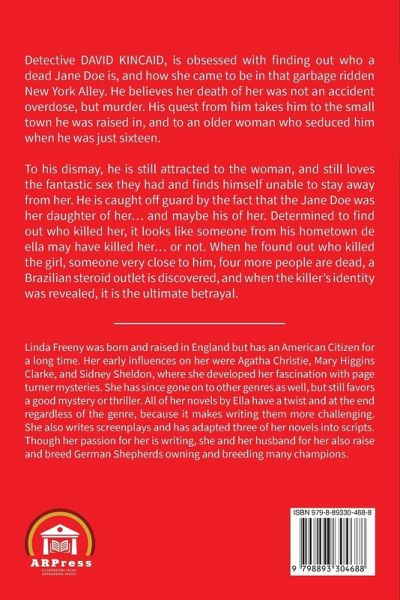 Detective DAVID KINCAID, is obsessed by finding out who a dead Jane Doe is, and how she came to be in that garbage ridden New York Alley. He believes her death was not an accident overdose, but murder. His quest takes him to the small town he was raised in, and to an older woman who seduced him when he was just sixteen.To his dismay, he still attracted to the woman, and still loves the fantastic sex they had and finds himself unable to stay away from her. He is caught off guard by the fact that the Jane Doe was her daughter...and maybe his. Determined to find out who killed her, it looks like someone from his hometown may have killed her... or not. When he find out who killed the girl, someone very close to him, four more people are dead, a Brazilian steroid outlet is discovered, and when the killer's identity was revealed, it is the ultimate betrayal.