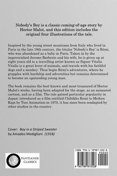 Nobody's Boy is a classic coming-of-age story by Hector Malot, and this edition includes the original four illustrations of the tale. Inspired by the young street musicians from Italy who lived in Paris in the late 19th century, the titular 'Nobody's Boy' is Rémi, who was abandoned as a baby in Paris. Taken in by the impoverished Jerome Barberin and his wife, he is given up at eight years old to a travelling artist known as Signor Vitalis. Vitalis is a great lover of animals, and travels with his faithful dogs and a monkey. Thus begin Rémi's adventures, where he grapples with hardship and adversities but remains determined to become an upstanding young man. The book remains the best-known and most-treasured of Hector Malot's works, having been adapted for the stage, as an animated cartoon, and as a film. The tale gained particular popularity in Japan; introduced as a film entitled Chibikko Remi to Meiken Kapi by Toei Animation in 1970, it has since been readapted by other studios in the country.