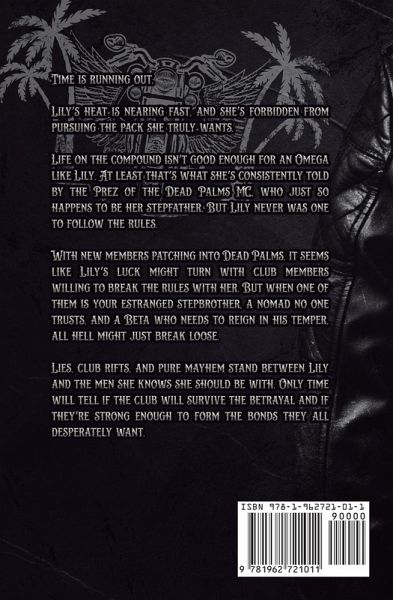 Time is running out. Lily's heat is nearing fast, and she's forbidden from pursuing the pack she truly wants. Life on the compound isn't good enough for an Omega like Lily. At least that's what she's consistently told by the Prez of the Dead Palms MC, who just so happens to be her stepfather. But Lily never was one to follow the rules. With new members patching into Dead Palms, it seems like Lily's luck might turn with club members willing to break the rules with her and form a pack. But when one of them is your estranged stepbrother, a nomad no one trusts, and a Beta who needs to reign in his temper, all hell might just break loose. Lies, club rifts, and pure mayhem stand between Lily and the men she knows she should be with. Only time will tell if the club will survive the betrayal and if they're strong enough to form the bonds they all desperately want.