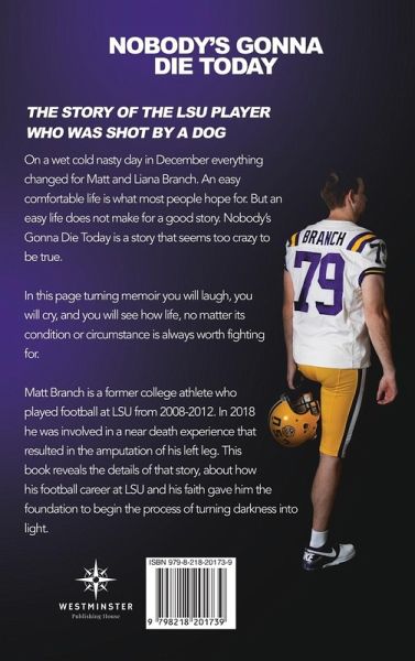 THE STORY OF THE LSU PLAYER WHO WAS SHOT BY A DOG On a wet cold nasty day in December everything changed for Matt and Liana Branch. An easy comfortable life is what most people hope for. But an easy life does not make for a good story. Nobody's Gonna Die Today is a story that seems too crazy to be true. In this page turning memoir you will laugh, you will cry, and you will see how life, no matter its condition or circumstance is always worth fighting for. Matt Branch is a former college athlete who played football at LSU from 2008-2012. In 2018 he was involved in a near death experience that resulted in the amputation of his left leg. This book reveals the details of that story, about how his football career at LSU and his faith gave him the foundation to begin the process of turning darkness into light.