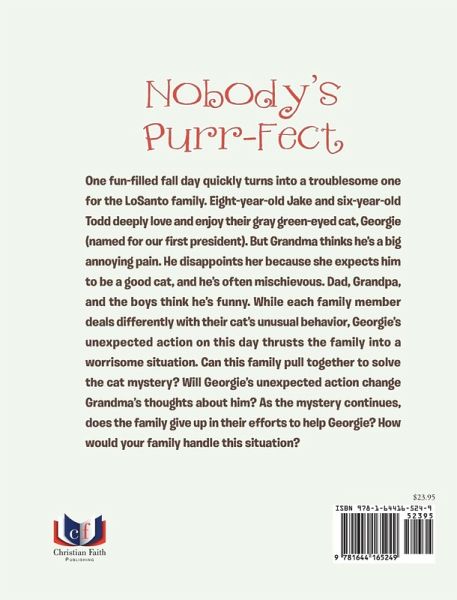 One fun-filled fall day quickly turns into a troublesome one for the LoSanto family. Eight-year-old Jake and six-year-old Todd deeply love and enjoy their gray green-eyed cat, Georgie (named for our first president). But Grandma thinks he's a big annoying pain. He disappoints her because she expects him to be a good cat, and he's often mischievous. Dad, Grandpa, and the boys think he's funny. While each family member deals differently with their cat's unusual behavior, Georgie's unexpected action on this day thrusts the family into a worrisome situation. Can this family pull together to solve the cat mystery? Will Georgie's unexpected action change Grandma's thoughts about him? As the mystery continues, does the family give up in their efforts to help Georgie? How would your family handle this situation?