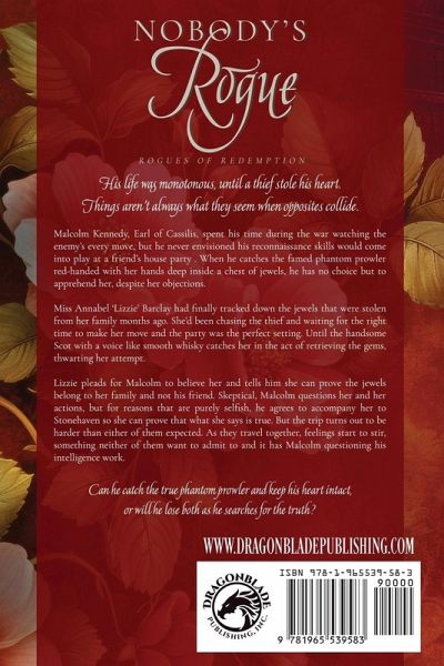 His life was monotonous, until a thief stole his heart. Things aren't always what they seem when opposites collide. Malcolm Kennedy, Earl of Cassilis, spent his time during the war watching the enemy's every move, but he never envisioned his reconnaissance skills would come into play at a friend's house party . When he catches the famed phantom prowler red-handed with her hands deep inside a chest of jewels, he has no choice but to apprehend her, despite her objections. Miss Annabel 'Lizzie' Barclay had finally tracked down the jewels that were stolen from her family months ago. She'd been chasing the thief and waiting for the right time to make her move and the party was the perfect setting. Until the handsome Scot with a voice like smooth whisky catches her in the act of retrieving the gems, thwarting her attempt. Lizzie pleads for Malcolm to believe her and tells him she can prove the jewels belong to her family and not his friend. Skeptical, Malcolm questions her and her actions, but for reasons that are purely selfish, he agrees to accompany her to Stonehaven so she can prove that what she says is true. But the trip turns out to be harder than either of them expected. As they travel together, feelings start to stir, something neither of them want to admit to and it has Malcolm questioning his intelligence work. Can he catch the true phantom prowler and keep his heart intact, or will he lose both as he searches for the truth? Rogues of Redemption Book 1 - Sweet Rogue O' Mine Book 2 - Rogue You Like a Hurricane Book 3 - No Rogue Like You Book 4 - Nobody's Rogue Book 5 - Here I Rogue Again
