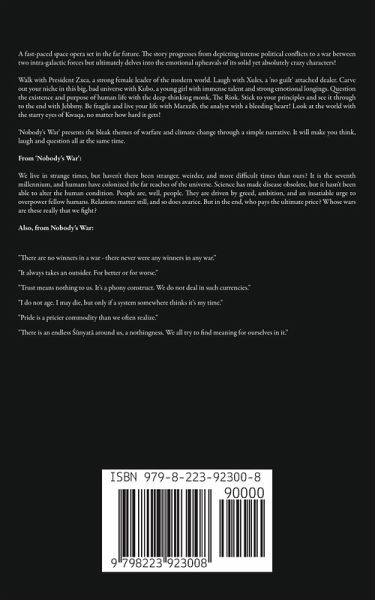 A fast-paced space opera set in the far future. The story progresses from depicting intense political conflicts to a war between two intra-galactic forces but ultimately delves into the emotional upheavals of its solid yet absolutely crazy characters! Walk with President Zxea, a strong female leader of the modern world. Laugh with Xules, a 'no guilt' attached dealer. Carve out your niche in this big, bad universe with Kubo, a young girl with immense talent and strong emotional longings. Question the existence and purpose of human life with the deep-thinking monk, The Riok. Stick to your principles and see it through to the end with Jebbmy. Be fragile and live your life with Marxzib, the analyst with a bleeding heart! Look at the world with the starry eyes of Kwaqa, no matter how hard it gets! 'Nobody's War' presents the bleak themes of warfare and climate change through a simple narrative. It will make you think, laugh and question all at the same time. From 'Nobody's War': We live in strange times, but haven't there been stranger, weirder, and more difficult times than ours? It is the seventh millennium, and humans have colonized the far reaches of the universe. Science has made disease obsolete, but it hasn't been able to alter the human condition. People are, well, people. They are driven by greed, ambition, and an insatiable urge to overpower fellow humans. Relations matter still, and so does avarice. But in the end, who pays the ultimate price? Whose wars are these really that we fight? Also, from Nobody's War: "There are no winners in a war - there never were any winners in any war." "It always takes an outsider. For better or for worse." "Trust means nothing to us. It's a phony construct. We do not deal in such currencies." "I do not age. I may die, but only if a system somewhere thinks it's my time." "Pride is a pricier commodity than we often realize." "There is an endless ¿¿nyat¿ around us, a nothingness. We all try to find meaning for ourselves in it."