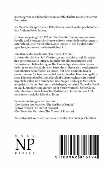 In dieser Geschichte läuft Chesterton zur Hochform auf: Er spinnt eine geheimnisvolle Intrige, gespickt mit philosophischen und theologischen Betrachtungen. Der Landadlige Vane, über den es heißt, er sei ein Mann, der sich besonders rühme, sich von keinerlei Dummheiten beeinflussen zu lassen, mit dem Resultat, dass er immer dumme Sachen mache, hat aus Afrika drei Bäume eingeführt. Diese Bäume stehen bei den abergläubischen Nachbarn in Verruf - angeblich sollen sie Krankheiten übertragen und sogar Menschen verspeisen. Um den Irrsinn zu widerlegen, verbringt Vane die Nacht im Wald. Am nächsten Morgen ist er verschwunden. Seine Gäste, unter ihnen ein amerikanischer Kritiker, ein Jurist und ein Arzt, machen sich auf, das Rätsel zu lösen.