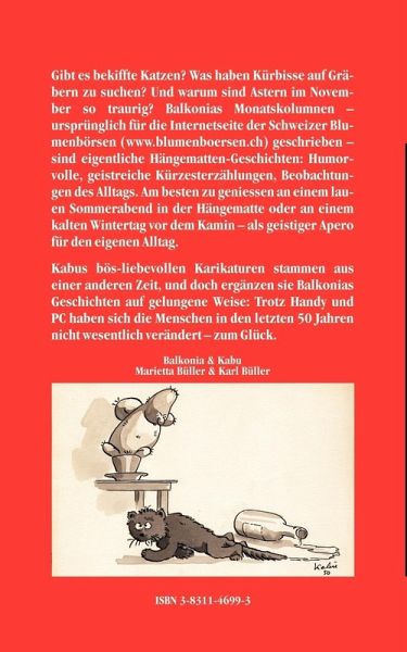 Gibt es bekiffte Katzen? Was haben Kürbisse auf Gräbern zu suchen? Und warum sind Astern im November so traurig? Balkonias Monatskolumnen - ursprünglich für die Internetseite der Schweizer Blumenbörsen geschrieben - sind eigentliche Hängematten-Geschichten: Humorvolle, geistreiche Kürzesterzählungen, Beobachtungen des Alltags. Am besten zu geniessen an einem lauen Sommerabend in der Hängematte oder an einem kalten Wintertag vor dem Kamin - als geistiger Apero für den eigenen Alltag. Kabus bös-liebevollen Karikaturen stammen aus einer anderen Zeit, und doch ergänzen sie Balkonias Geschichten auf gelungene Weise: Trotz Handy und PC haben sich die Menschen in den letzten 50 Jahren nicht wesentlich verändert - zum Glück.