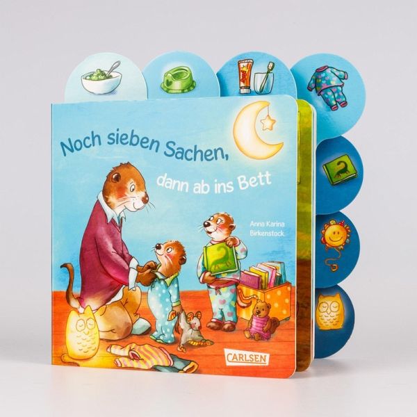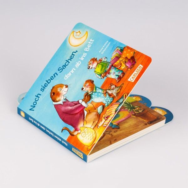 Der Zug fährt von Station zu Station, von Abenbrottisch über Bad bis ins gemütliche Bett. Und unterwegs sammeln die Kinder sieben Sachen ein, die sie fürs Zubettgehen und Einschlummern brauchen. Wer entdeckt alles auf dem Registern wieder?