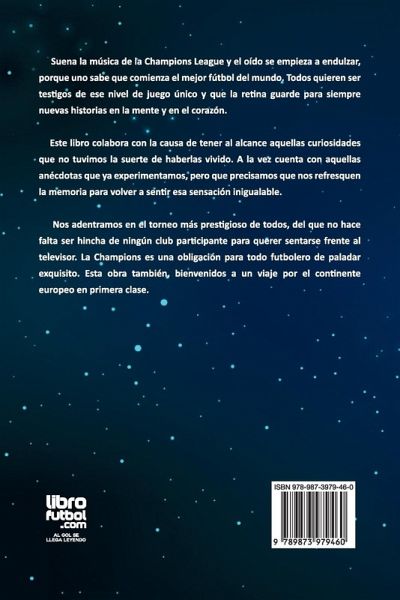 Suena la música de la Champions League y el oído se empieza a endulzar, porque uno sabe que comienza el mejor fútbol del mundo. Todos quieren ser testigos de ese nivel de juego único y que la retina guarde para siempre nuevas historias en la mente y en el corazón. Este libro colabora con la causa de tener al alcance aquellas curiosidades que no tuvimos la suerte de haberlas vivido. A la vez cuenta con aquellas anécdotas que ya experimentamos, pero que precisamos que nos refresquen la memoria para volver a sentir esa sensación inigualable. Nos adentramos en el torneo más prestigioso de todos, del que no hace falta ser hincha de ningún club participante para querer sentarse frente al televisor. La Champions es una obligación para todo futbolero de paladar exquisito. Esta obra también, bienvenidos a un viaje por el continente europeo en primera clase.