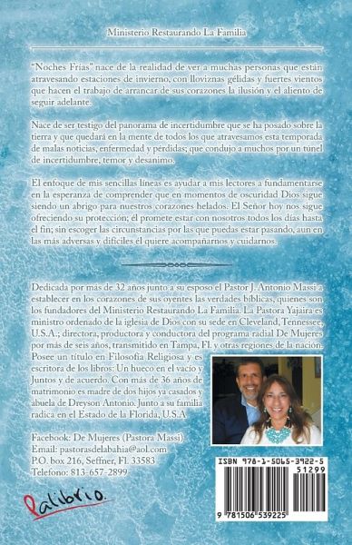 Ministerio Restaurando La Familia ______________________________________________________________ "Noches Frías" nace de la realidad de ver a muchas personas que están atravesando estaciones de invierno, con lloviznas gélidas y fuertes vientos que hacen el trabajo de arrancar de sus corazones la ilusión y el aliento de seguir adelante. Nace de ser testigo del panorama de incertidumbre que se ha posado sobre la tierra y que quedará en la mente de todos los que atravesamos esta temporada de malas noticias, enfermedad y pérdidas; que condujo a muchos por un túnel de incertidumbre, temor y desanimo. El enfoque de mis sencillas líneas es ayudar a mis lectores a fundamentarse en la esperanza de comprender que en momentos de oscuridad Dios sigue siendo un abrigo para nuestros corazones helados. El Señor hoy nos sigue ofreciendo su protección; él promete estar con nosotros todos los días hasta el fin; sin escoger las circunstancias por las que puedas estar pasando, aun en las más adversas y difíciles él quiere acompañarnos y cuidarnos.