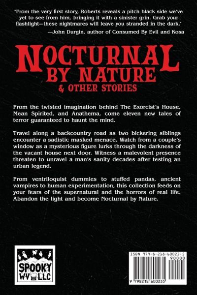 From the twisted imagination behind The Exorcist's House, Mean Spirited, and Anathema, come eleven new tales of terror guaranteed to haunt the mind. Travel along a backcountry road as two bickering siblings encounter a sadistic masked menace. Watch from a couple's window as a mysterious figure lurks through the darkness of the vacant house next door. Witness a malevolent presence threaten to unravel a man's sanity decades after testing an urban legend. From ventriloquist dummies to stuffed pandas, ancient vampires to human experimentation, this collection feeds on your fears of the supernatural and the horrors of real life. Abandon the light and become Nocturnal by Nature.