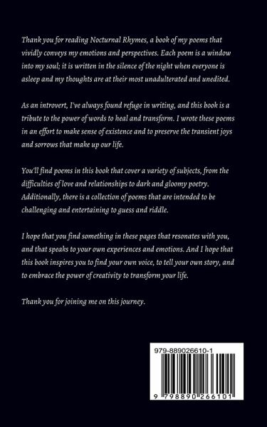 Nocturnal Rhymes is a collection of poems that explores the enigmatic and enticing nighttime environment. Each piece of writing offers a glimpse into the author's thoughts in the still, introspective moments just after midnight. With a pen in hand, the author creates vivid portraits of unrefined feelings, conflicts, and epiphanies. The author examines the beauty and the darkness that are all around them in the midnight world via their poetry. The author asks readers to accompany them on their voyage of self-discovery as the shadows take on new significance. Each poem in Nocturnal Rhymes is a monument to the strength of language and the breadth of human feeling, whether it is a heartbreaking ballad, a lighthearted limerick, or a thought-provoking verse. Nocturnal Rhymes is a book that everyone who has ever sought comfort during the nighttime should read. Come on, let's stroll the streets, dance under the stars and moon, and explore the wonder of the night with these enthralling and moving poems.