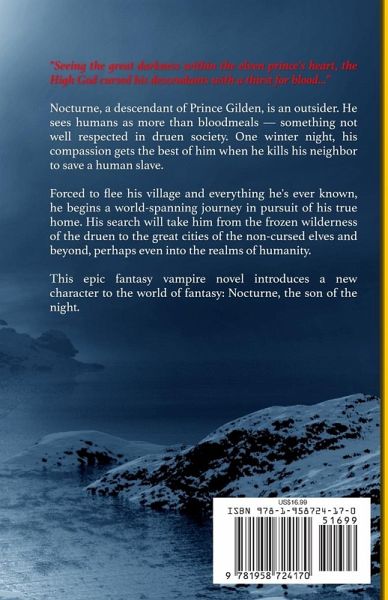 "Seeing the great darkness within the elven prince's heart, the High God cursed his descendants with a thirst for blood..." Nocturne, a descendant of Prince Gilden, is an outsider. He sees humans as more than bloodmeals - something not well respected in Druen society. One winter night, his compassion gets the best of him when he kills his neighbor to save a human slave.Forced to flee his village and everything he's ever known, he begins a world-spanning journey in pursuit of his true home. His search will take him from the frozen wilderness of the Druen to the great cities of the non-cursed Elves and beyond, perhaps even into the realms of humanity. This epic fantasy vampire novel introduces a new character to the world of fantasy: Nocturne, the son of the night. Unique to the print editions, this paperback includes a map of northern Varda.