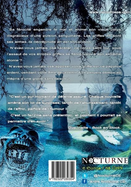 Sa férocité engendre le mal et anime son vieux corps disgracieux d'une pulsion sanguinaire. Les griffes en sont ses armes, la décrépitude en est son poison.N'avez-vous jamais osé lacérer ce corps saint qui, sous l'assaut de vos étroites griffes, se flétrit jusqu'à son extrême atonie ?N'avez-vous jamais apposer votre griffe sur ce papyrus ardent, vendant votre âme décadente à ce pervers démon, au mépris d'une gloire sans raison ?"Griffes et Décrépitude"
