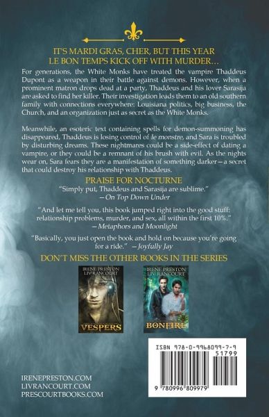 It's Mardi Gras, cher, but this year le bon temps kick off with murder… For generations, the White Monks have treated the vampire Thaddeus Dupont as a weapon in their battle against demons. However, when a prominent matron drops dead at a party, Thaddeus and his lover Sarasija are asked to find her killer. Their investigation leads them to an old southern family with connections everywhere: Louisiana politics, big business, the Church, and an organization just as secret as the White Monks. Meanwhile, an esoteric text containing spells for demon-summoning has disappeared, Thaddeus is losing control of le monstre, and Sara is troubled by disturbing dreams. These nightmares could be a side-effect of dating a vampire, or they could be a remnant of his brush with evil. As the nights wear on, Sara fears they are a manifestation of something darker – a secret that could destroy his relationship with Thaddeus.