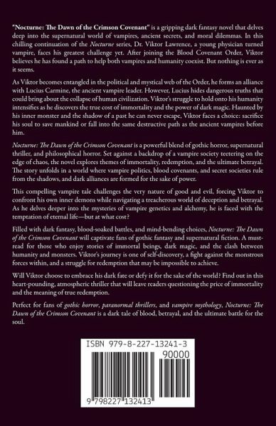 "Nocturne: The Dawn of the Crimson Covenant" is a gripping dark fantasy novel that delves deep into the supernatural world of vampires, ancient secrets, and moral dilemmas. In this chilling continuation of the Nocturne series, Dr. Viktor Lawrence, a young physician turned vampire, faces his greatest challenge yet. After joining the Blood Covenant Order, Viktor believes he has found a path to help both vampires and humanity coexist. But nothing is ever as it seems. As Viktor becomes entangled in the political and mystical web of the Order, he forms an alliance with Lucius Carmine, the ancient vampire leader. However, Lucius hides dangerous truths that could bring about the collapse of human civilization. Viktor's struggle to hold onto his humanity intensifies as he discovers the true cost of immortality and the power of dark magic. Haunted by his inner monster and the shadow of a past he can never escape, Viktor faces a choice: sacrifice his soul to save mankind or fall into the same destructive path as the ancient vampires before him. Nocturne: The Dawn of the Crimson Covenant is a powerful blend of gothic horror, supernatural thriller, and philosophical horror. Set against a backdrop of a vampire society teetering on the edge of chaos, the novel explores themes of immortality, redemption, and the ultimate betrayal. The story unfolds in a world where vampire politics, blood covenants, and secret societies rule from the shadows, and dark alliances are formed for the sake of power. This compelling vampire tale challenges the very nature of good and evil, forcing Viktor to confront his own inner demons while navigating a treacherous world of deception and betrayal. As he delves deeper into the mysteries of vampire genetics and alchemy, he is faced with the temptation of eternal life-but at what cost? Filled with dark fantasy, blood-soaked battles, and mind-bending choices, Nocturne: The Dawn of the Crimson Covenant will captivate fans of gothic fantasy and supernatural fiction. A must-read for those who enjoy stories of immortal beings, dark magic, and the clash between humanity and monsters. Viktor's journey is one of self-discovery, a fight against the monstrous forces within, and a struggle for redemption that may be impossible to achieve. Will Viktor choose to embrace his dark fate or defy it for the sake of the world? Find out in this heart-pounding, atmospheric thriller that will leave readers questioning the price of immortality and the meaning of true redemption. Perfect for fans of gothic horror, paranormal thrillers, and vampire mythology, Nocturne: The Dawn of the Crimson Covenant is a dark tale of blood, betrayal, and the ultimate battle for the soul.