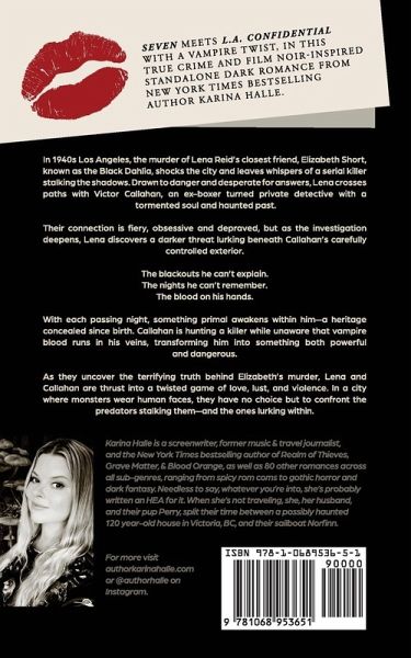 A vampire romance so dark it'll bite. He's not just dangerous-he's designed to destroy you. Blood. Obsession. Murder. And a love story twisted enough to hurt so good. Los Angeles, 1947. The city is drowning in secrets and blood-and Lena Reid just lost her best friend to the shadows. Elizabeth Short is dead. The press calls her the Black Dahlia. Lena wants answers. Closure. Revenge. What she finds instead... is him. Victor Callahan is danger in a three-piece suit. An ex-boxer with fists like thunder and eyes that promise ruin. He's supposed to help her. Instead, he haunts her. Follows her. Wants her. He doesn't remember what happens after dark. The blackouts. The blood. The hunger. But Lena's not afraid of monsters. She falls for them. She is one. Now, with a serial killer circling closer and a secret society pulling strings behind the curtain, Lena has one rule left: Don't let a vampire fall in love with you. Because once he does... He'll never let you go. Seven meets L.A. Confidential with a vampire twist, in this true crime and film noir-inspired standalone dark romance from New York Times Bestselling author Karina Halle. This book contains mature content with potential triggers--please consult the Content Warning at the start of the book.