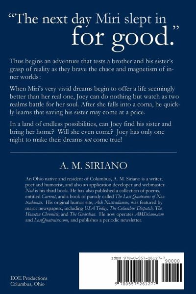 When Miri's very vivid dreams begin to offer a life seemingly better than her real one, her brother Joey can do nothing but watch as two realms battle for her soul. After Miri falls into a coma, Joey quickly learns that saving his sister may come at a price. In a land of endless possibilities, can Joey find Miri and bring her home? Will she even come? Joey has only one night to make their dream NOT come true!