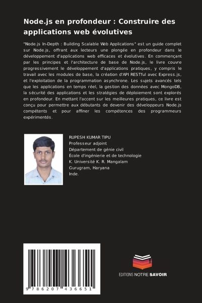 "Node.js In-Depth : Building Scalable Web Applications" est un guide complet sur Node.js, offrant aux lecteurs une plongée en profondeur dans le développement d'applications web efficaces et évolutives. En commençant par les principes et l'architecture de base de Node.js, le livre couvre progressivement le développement d'applications pratiques, y compris le travail avec les modules de base, la création d'API RESTful avec Express.js, et l'exploitation de la programmation asynchrone. Les sujets avancés tels que les applications en temps réel, la gestion des données avec MongoDB, la sécurité des applications et les stratégies de déploiement sont explorés en profondeur. En mettant l'accent sur les meilleures pratiques, ce livre est conçu pour permettre aux débutants de devenir des développeurs Node.js compétents et pour affiner les compétences des programmeurs expérimentés.