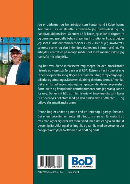 Jeg er uddannet og har arbejdet som kontormand i Københavns Kommune i 25 år. Herefter erhvervede jeg buskørekort og tog handicapuddannelsen. Gennem 12 år kørte jeg ældre til dagcentre og børn med specielle behov til særlige institutioner. I dag arbejder jeg som kundeservicemedarbejder i City 2. Her er jeg involveret i centrets events og den indendørs skøjtebane i vinterhalvåret. Mit arbejde i centret er på mange måder det mest meningsfyldte jeg har haft i mit arbejdsliv. Jeg har over årene interesseret mig meget for den amerikanske historie og været på flere rejser til USA. Rejserne har inspireret mig til denne oplevelsesbog. Bogen er et sammendrag af rejsedagbøger, billeder og erindringer. Det er en skildring af mit møde med Amerika. Det er en fortælling om utroligt mange spændende rejseoplevelser, flotte, sære og fængslende naturfænomener som jeg stadig kan se for mig. Det er mit håb at min historie vil inspirere dig som læser til et eventyr i det store land på den anden side af Atlanten ... og udleve din amerikanske drøm. Denne bog er andet og mere end en rejsebog i gængs forstand. Det er en fortælling om rejser til USA, som man kan få forstand af, hvis man agter sig over det store vand, men det er også en stærkt personlig livsskildring af et langt liv og samliv med de personer der har gjort indtryk på forfatteren på godt og ondt.